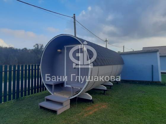 Эта круглая красавица — идеальный вариант для тех, кто ценит эстетику классической бани-бочки, но хочет получить современный комфорт и долговечность конструкции.