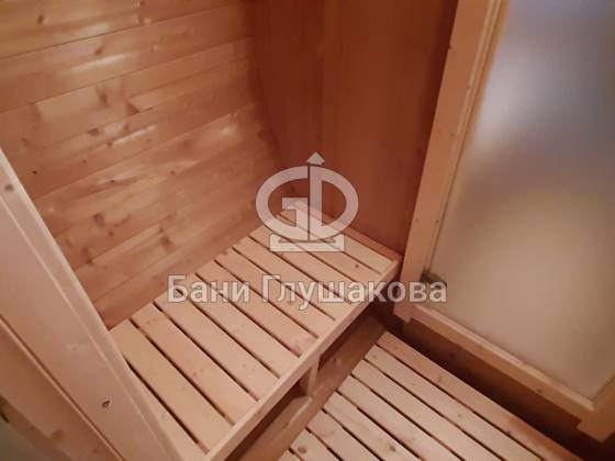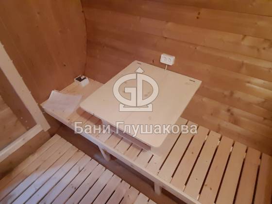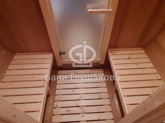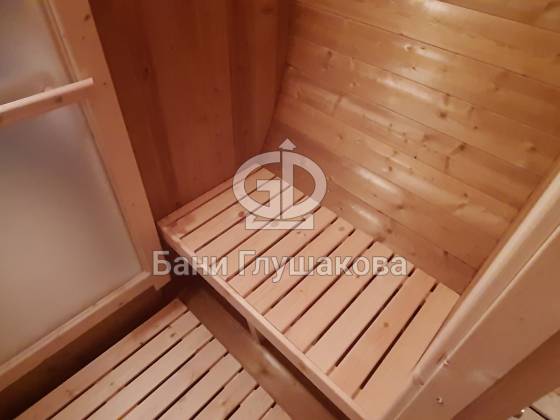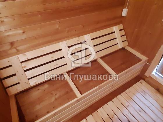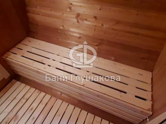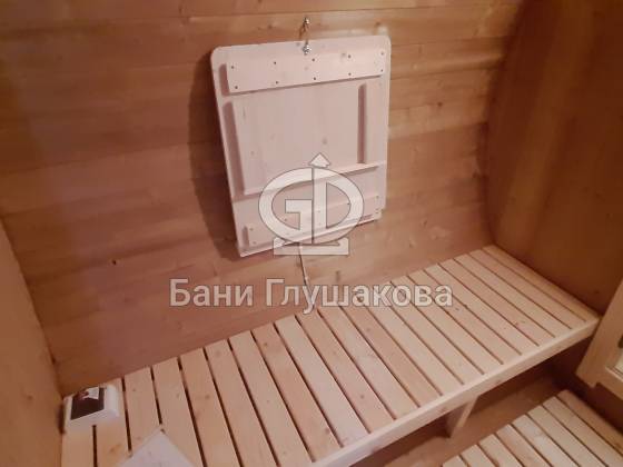 Баня состоит из трёх помещений: предбанника, помывочной и парной. У входа — уютная терраса, где приятно посидеть после парной, укрываясь от солнца или дождя.