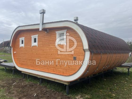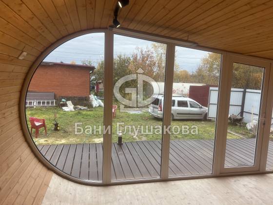 На этот раз мы построили баню «Танк Панорама» — современный вариант с панорамным остеклением и просторной террасой-подиумом.