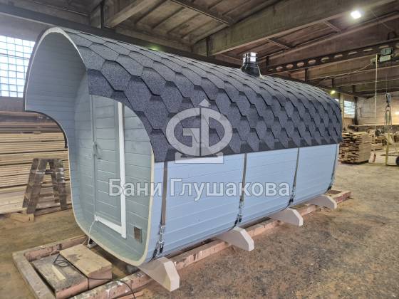 Конструкция выполнена из прочных и долговечных материалов, обеспечивающих тепло и защиту от влаги. За счёт округлой формы, характерной для бани-бочки, помещение выглядит аккуратно и современно, а внутри сохраняется уют и комфорт.
