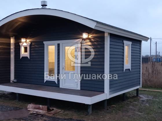 Глубокий тёмно-синий оттенок подчёркивает форму, делает баню визуально дорогой и благородной, а белая окантовка добавляет аккуратности и чистоты линий. Вечером, когда включается мягкий свет, баня будто растворяется в сумерках и выглядит особенно уютно — точно маленький домик, где всегда тепло и спокойно.