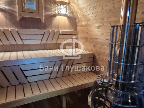 Квадратное сечение (квадро) дает заметно больше внутреннего объема и высоты потолков по сравнению с классическим кругом, поэтому внутри дышится легко и места хватает всем. Баня уже укомплектована фирменной печью, баком для воды и удобными полками — всё готово к первой протопке сразу после установки на участке.
