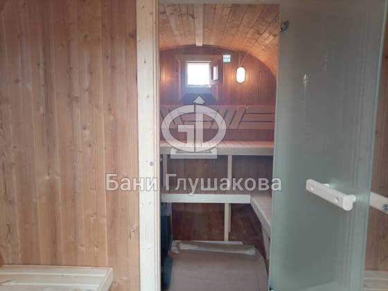 За счет ширины 2,3 метра внутри очень просторно. Если в обычной круглой бочке иногда хочется чуть больше «воздуха» над головой, то здесь с этим полный порядок. Поставили её в этот раз на сваи, смотрится солидно, а контрастная белая отделка дверей и окон на темном фоне добавляет ей какой-то нарядности, что ли.