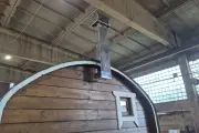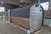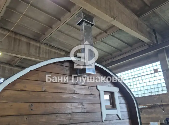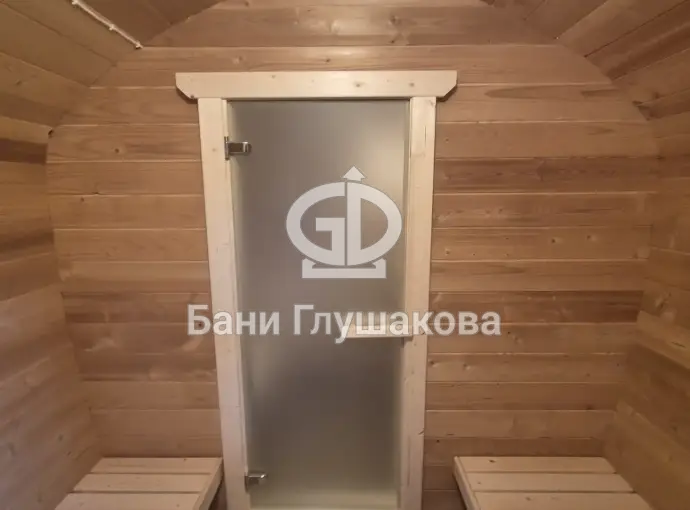 Баня сделана из бочковой термодоски, которая идеально подходит для строительства бань-бочек – она не набирает влагу и не рассыхается при смене сезонов. Подтягивать эту баню не нужно.