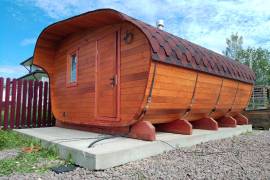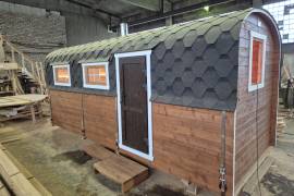 Если обычная баня-бочка кажется вам слишком тесной, а классический сруб — слишком громоздким, то серия «Танк» создана именно для вас. Свое название эти бани получили не случайно: за счет уникальной формы со скругленными углами и расширенным основанием они выглядят массивно и солидно, а полезного пространства внутри гораздо больше, чем в стандартных круглых банях из бочковой доски.