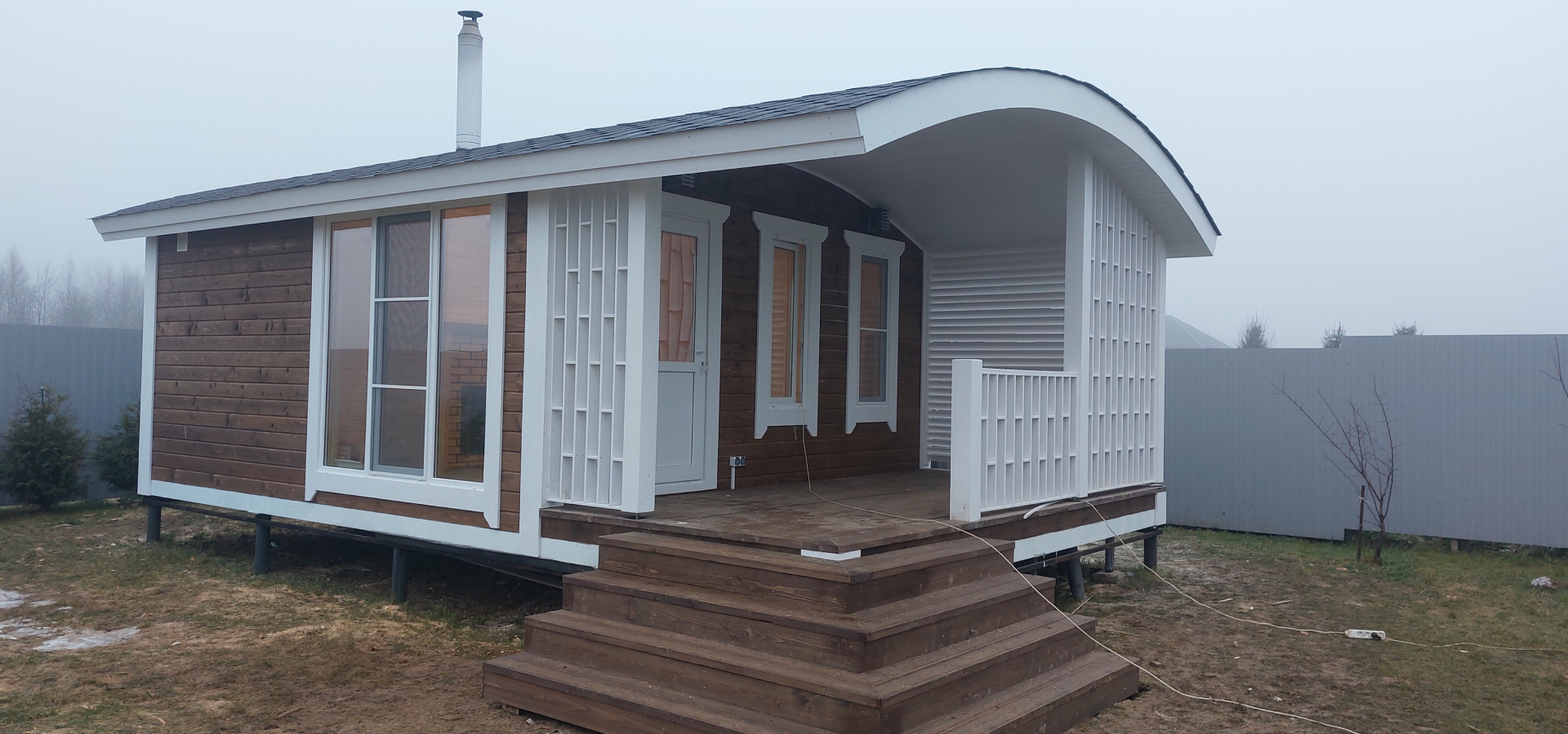 Баня собирается по каркасной технологии внахлест — то есть доски монтируются с небольшим заходом друг на друга. Благодаря этому создается красивый объемный эффект. Поддерживается он и округлой крышей, которая давно стала визитной карточкой бань от Дмитрия Глушакова. Контрастная покраска делает внешнюю отделку бани еще более нарядной. Можно заказать с террасой или без неё.