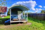 Баня строится по каркасной технологии с утеплением и отделкой доской внахлёст. Крыша — округлая фирменная. Внутри 4 помещения: парная, комната отдыха, душ и бойлерная.