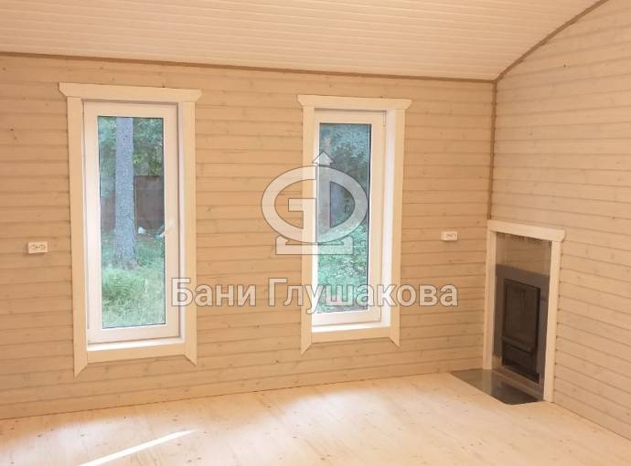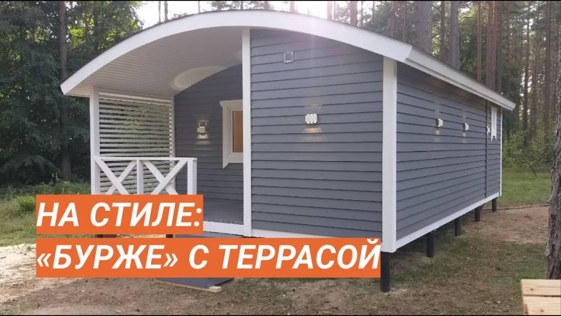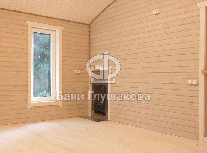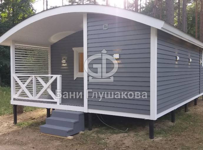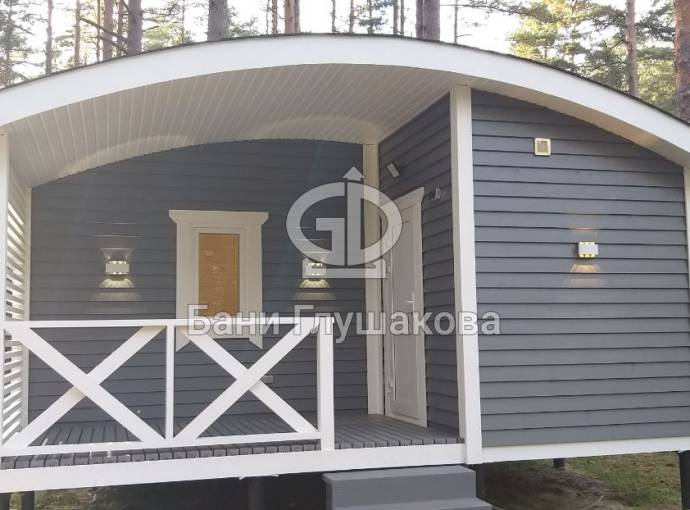 Размер бани — 5,3 × 8 метров, из которых 3,3 × 2 метра занимает уютная терраса — идеальное место для отдыха после парной или чашки чая на свежем воздухе.