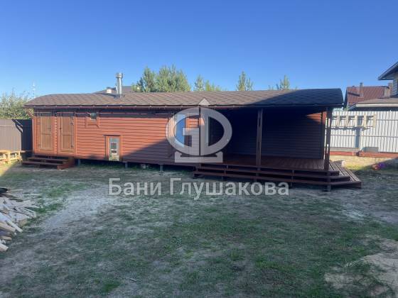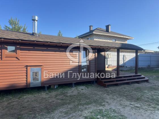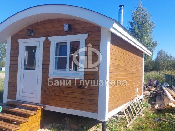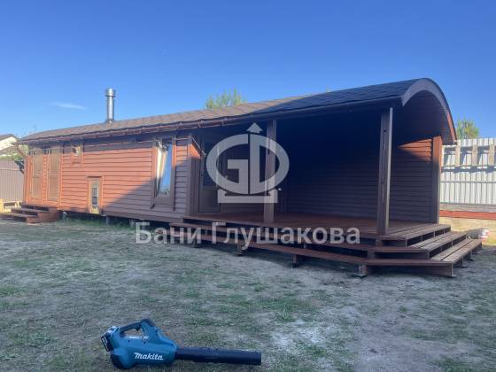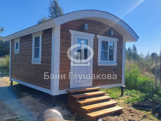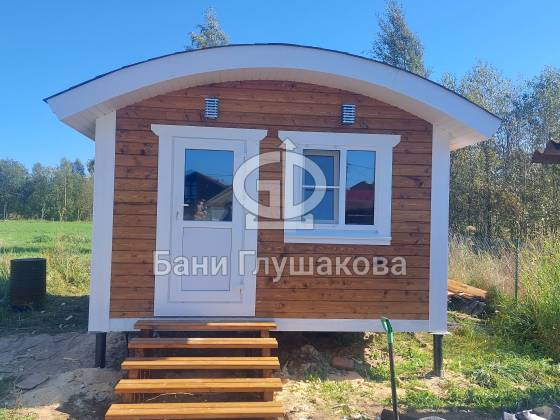 Баня собирается по каркасной технологии внахлест — то есть доски монтируются с небольшим заходом друг на друга. Благодаря этому создается красивый объемный эффект. Поддерживается он и округлой крышей, которая давно стала визитной карточкой бань от Дмитрия Глушакова. Контрастная покраска делает внешнюю отделку бани еще более нарядной. Можно заказать с террасой или без неё.