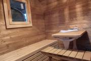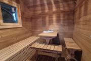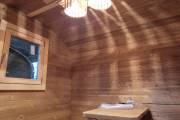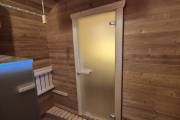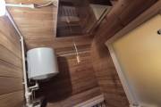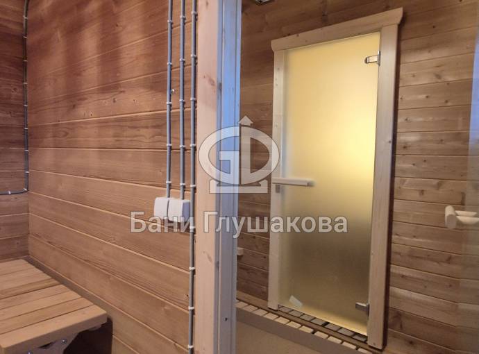 Размер 2,4 на 6 метров, 3 отделения – комната отдыха, душевое помещение, парная.