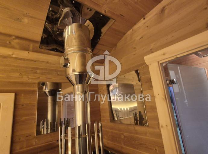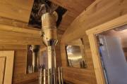 Комплектация топ: неубиваемая мебель, дизайнерская люстра «Тринити», автономная душевая система с бойлером, фрамуга в парной с калёным стеклом, выдвижные полки, вентиляция «Второе дыхание» и вместо «Димасту» новая система трёхконтурного дымохода с подачей тяги, металлический экран вокруг печи и удобные клапаны-задвижки. В общем, эта банька собрала в себе все наши последние улучшалки.
