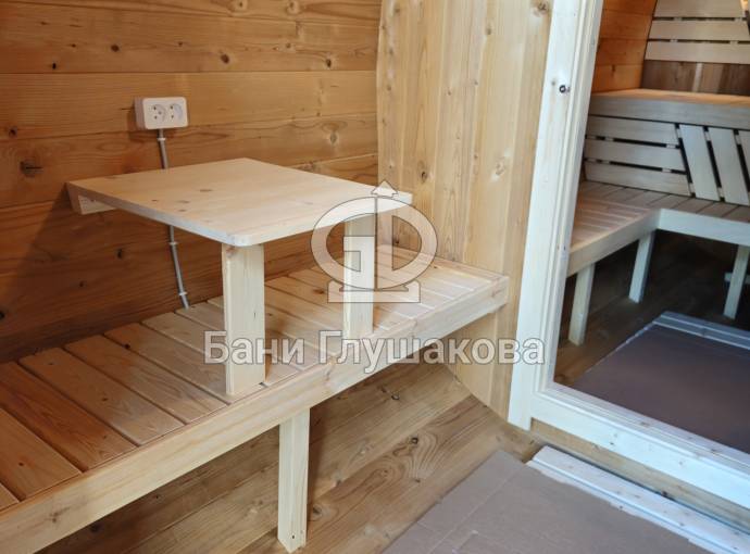 В стоимость уже входит сборка, печь нашего производства с двумя каменками и парогенератором, электрика, металлические уличные светильники, ступеньки. Вокруг печи стоит металлический экран. Установлены металлические комплектующие из нержавейки: вентиляционные клапаны-задвижки, крепления для проводки, наличник на форточку и порожек между помещениями. Ступеньки тоже уже входят в стоимость. Замечательная расстановка в парной: широкие полки поставлены углом, а печь сбоку. Поверьте нашему многолетнему опыту — это и правда самый удобный вариант.