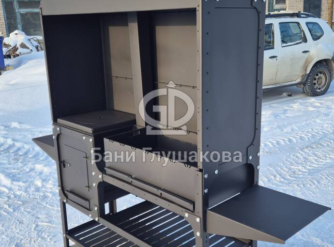 Продуманная эргономика: Мы предусмотрели боковые столики для посуды и специй, а также вместительную нижнюю полку для хранения дров и угля. Всё необходимое всегда под рукой.
