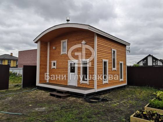 Изящные бани с фирменной округлой крышей и галереей высоких окон. Строим по каркасной технологии или из бруса на выбор.